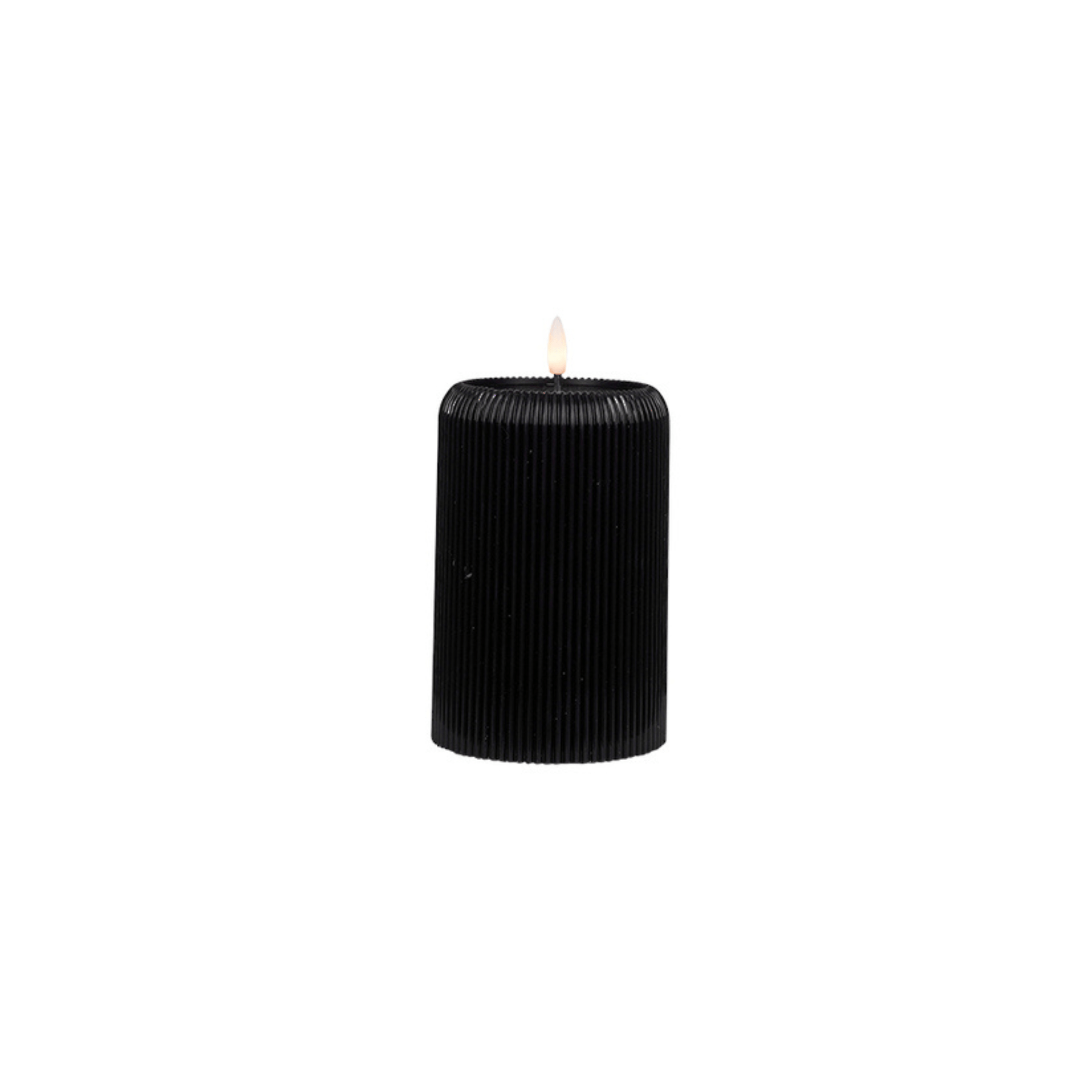 This Small Black LED Ribbed Pillar Candle combines the authentic look and feel of real wax with the safety and convenience of flameless illumination. Its elegant ribbed design adds subtle texture and depth, making it a refined accent for any setting. Enjoy the warm, flickering glow without worry, perfect for creating a sophisticated ambiance in your home or event space.