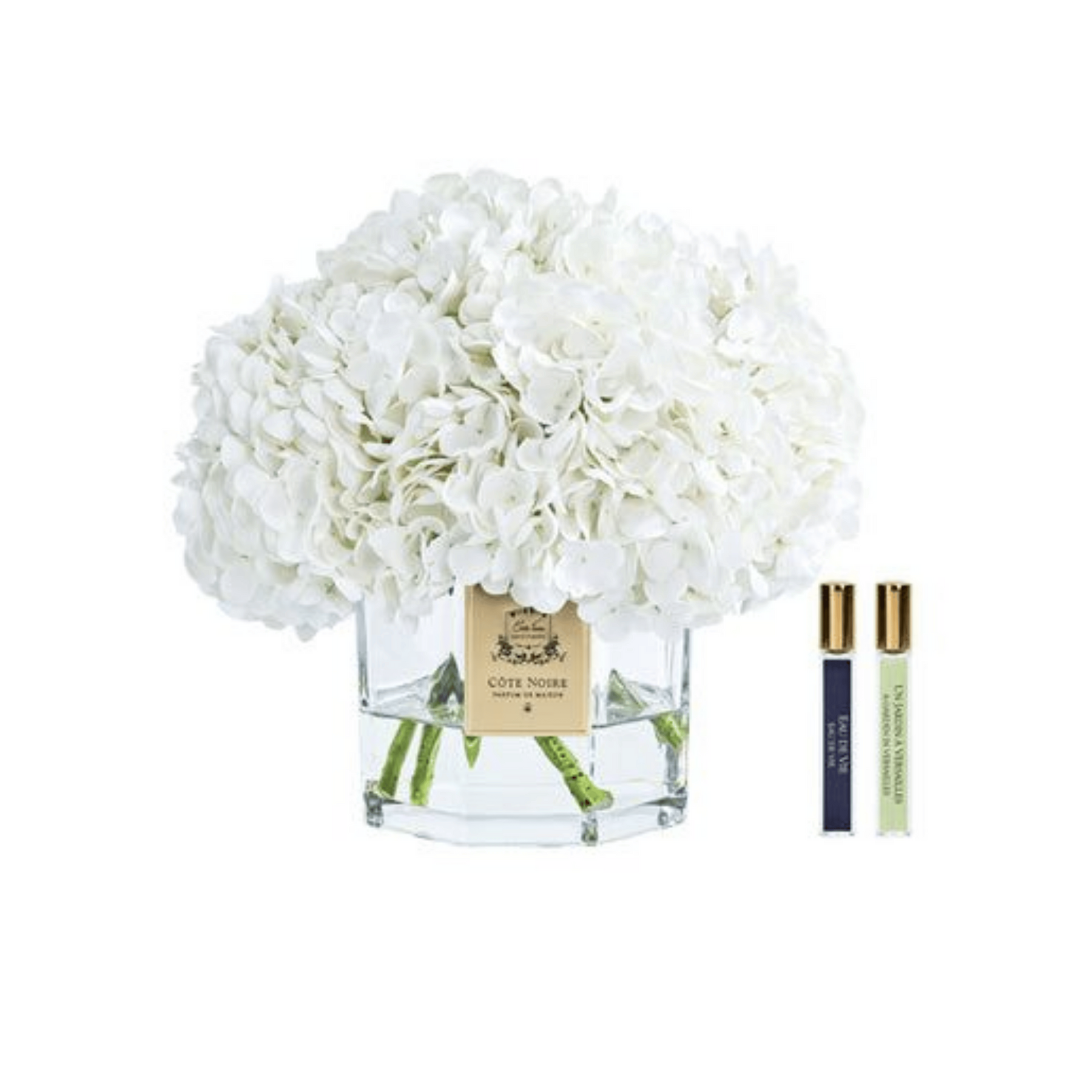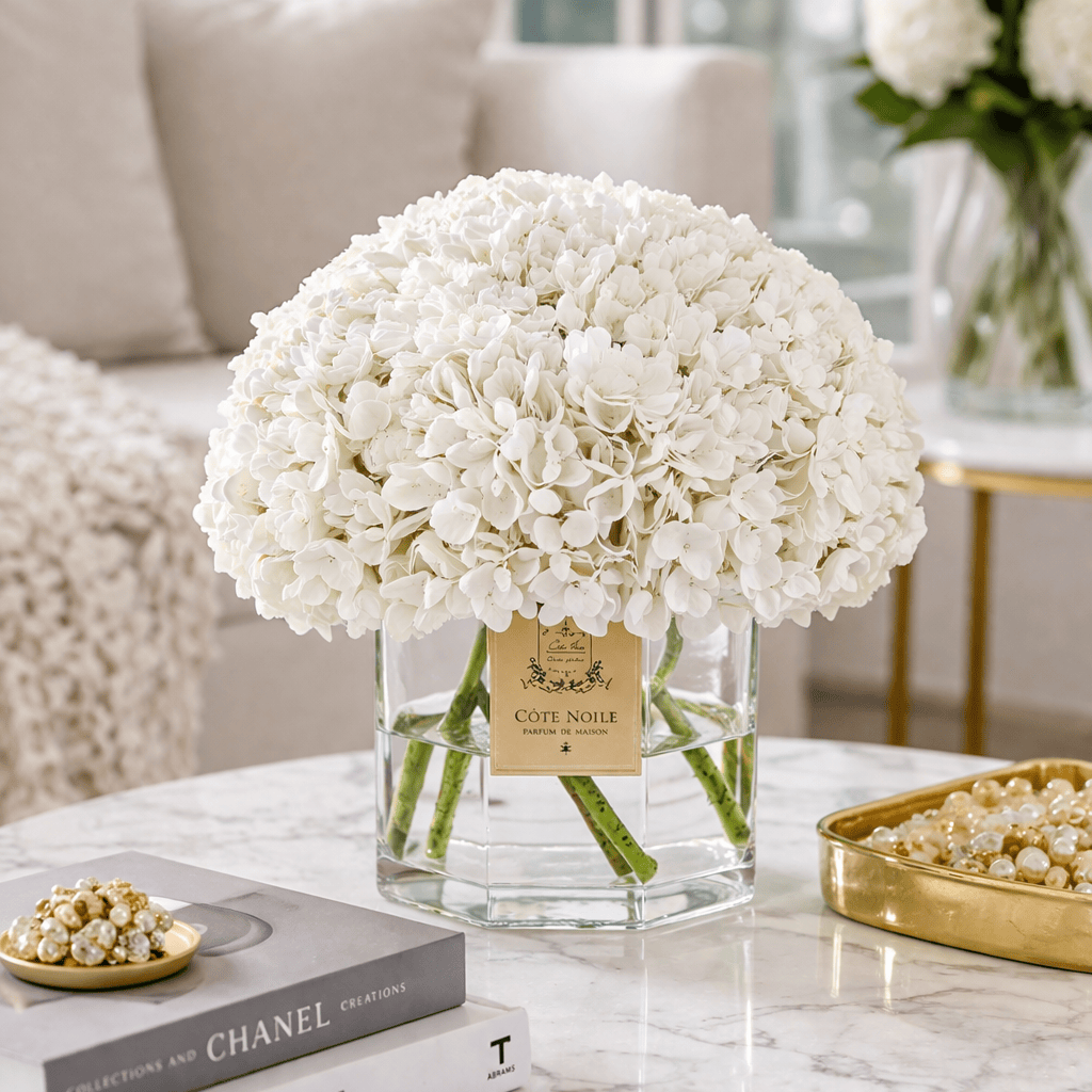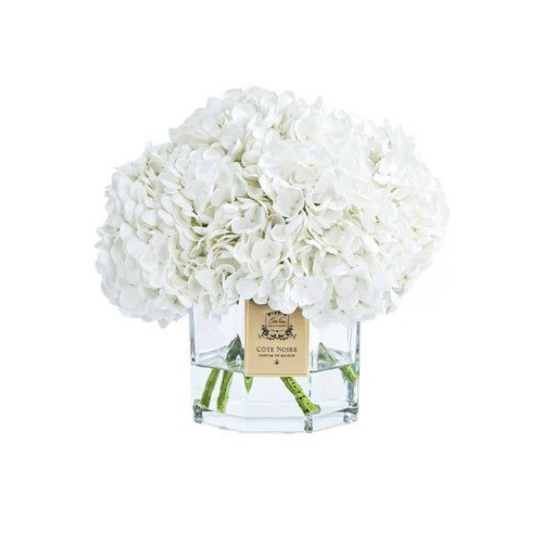 Cote Noire Classic White Hydrangea Bouquet in Glass Vase