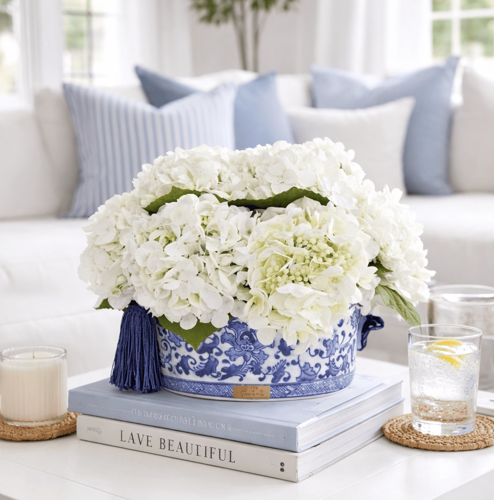 Elevate your space with the timeless elegance of Cote Noire's Ivory Hydrangeas. Nestled in a stunning blue and white oblong Chinoiserie pot, these faux flowers bring sophisticated charm to any room without the need for watering or maintenance. The lifelike ivory blooms paired with the classic hand-painted ceramic vessel create an instant focal point—perfect for shelves, desks, or side tables. Designed to last, these premium artificial flowers maintain their beauty season after season, making them an investment in enduring décor. A refined choice for those who appreciate botanical aesthetics with zero fuss.